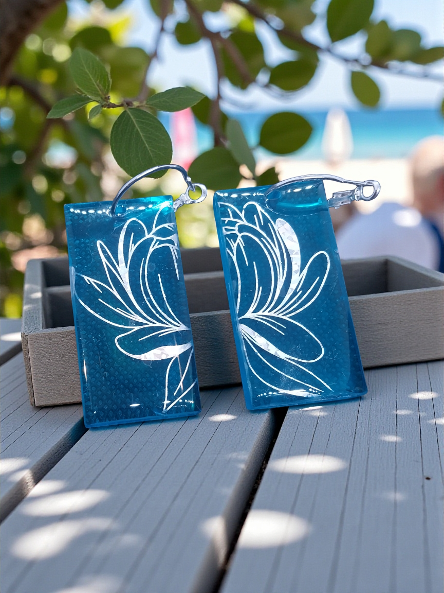 Handmade resin earrings- gorgeous blue with silver designs inside.